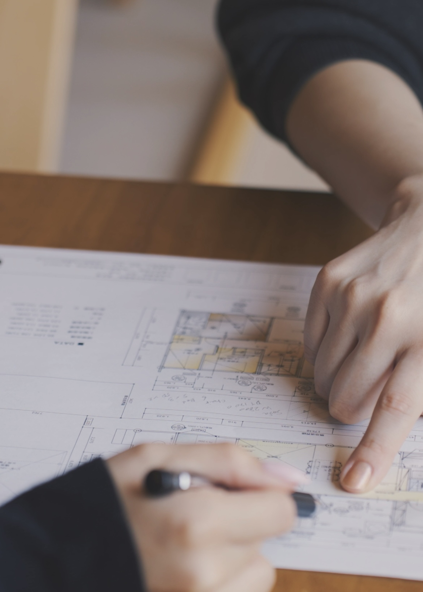シンプルな色遣いの中で、こだわりが感じられる内観づくりのために、グレーのソファとダイニングテーブル、親しみのある木素材の家具を選定しました。